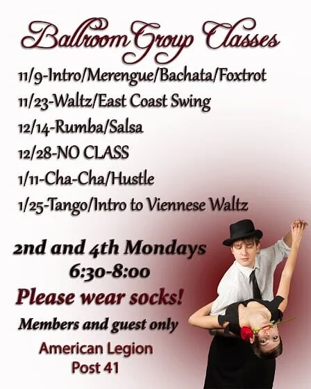 Ballroom Group Classes Monday, January 11, 2021 6:30 PM 8:00 PM 18:30 20:00 American Legion Post 41 Norwalk, Ohio (map) Google Calendar ICS Norwalk American Legion Post 41 will be having Ballroom Group Classes MUST be a member to participate and bring a guest First class starts Monday, November 11, at 6:30PM Come out and join the FUN!!!